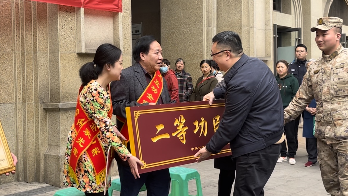 ????4月7日,伴隨陣陣鑼鼓聲時代港灣小區門口格外熱鬧副區長、區公安局局長楊正勇率隊為賈寶同志送二等功。