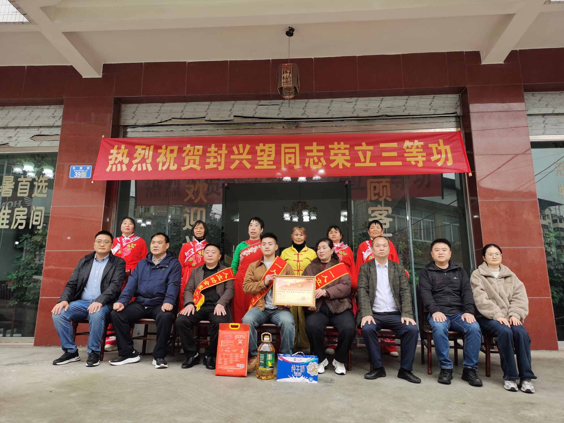 當(dāng)天,送喜報(bào)隊(duì)伍高舉橫幅,手捧喜報(bào),在陣陣喜慶的鑼鼓聲中,來到榮立三等功的現(xiàn)役軍人封興望家中,為軍屬佩戴“一人立功,全家光榮”的綬帶,鄭重遞上立功喜報(bào)和慰問金,并向他們表示熱烈祝賀。