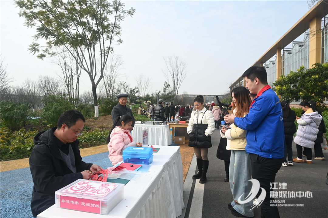 本次村晚精心設置了五大特色體驗區域,生動展現鄉村蓬勃生機與濃濃年味。特色農產品展銷區,富硒菜籽油、大雅耙耙柑、高山野生蜂蜜等江津特產琳瑯滿目,游客們爭相選購;非遺體驗區,米花糖、剪紙、竹編、糖畫等傳統技藝吸引了不少年輕人駐足體驗;書法楹聯互動區墨香四溢,書法家們揮毫潑墨,將新春祝福化作一副副紅火對聯贈予鄉親;農耕趣味體驗區更是歡聲不斷,游客通過趣味游戲感受農耕文化的樂趣。